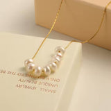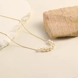 The Margot Pearl Necklace showcases eight lustrous pearls elegantly spaced along a delicate gold chain that moves freely for a graceful look. Measuring 16 inches with an adjustable clasp, it offers a customizable fit. Crafted to be waterproof, this necklace combines durability with timeless sophistication, making it a versatile accessory for both everyday wear and special occasions.