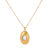 The Vivienne Necklace is the definition of timeless elegance. Featuring a delicate beaded chain paired with a stunning oval statement pendant, this piece showcases a luminous white oval stone at the center for a classic, refined look. Effortlessly chic with major old money vibes, Vivienne is perfect for everyday elegance or special occasions.