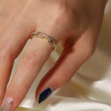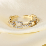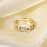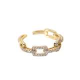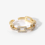 Expertly crafted, our Diamond Chain Link Ring seamlessly combines style and function. Made from waterproof materials, this adjustable and comfortable ring features a stunning gold link design adorned with sparkling diamonds. Add a touch of sophistication to any outfit with this must-have accessory.
